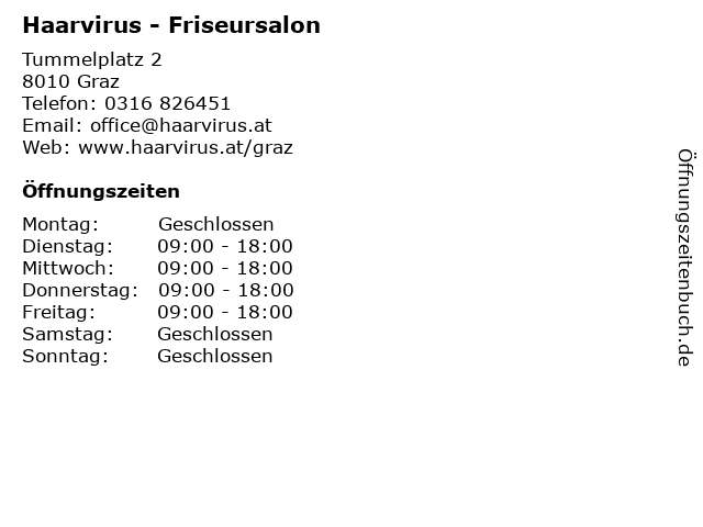 Frisör am Tummelplatz in 8010 Graz auf susiat mit Bewertungen Telefonnummer Anfahrtsplan usw. Haar Virus - Adresse Kontakt Graz Fotos Öffnungszeiten Telefon Email Webseite Friseur Impressum. Aktuelle Veranstaltungen aus dem FALTER Eventprogramm.